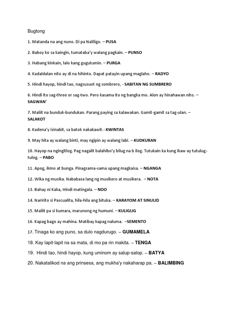 06112015 Heto na si Kaka bubuka-bukaka. Nagdaan si Kabo Negro namatay na lahat ang tao. 150 Mga Halimbawa ng Bugtong na may Sagot.