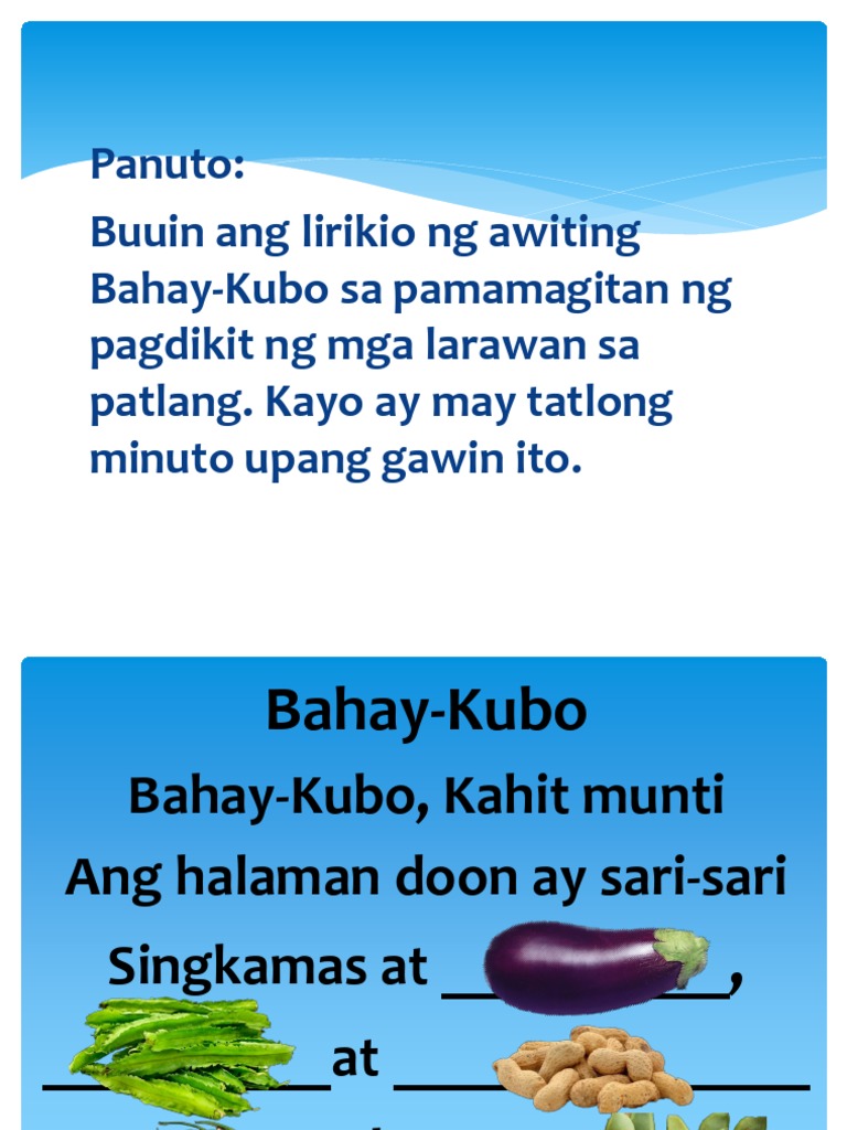 Filipino 28102019 1629 hajuyanadoy. Tungkol saan ang awiting bayan na bahay kubo. Made of indigenous building materials like bamboo and nipa this pre-Hispanic architecture was constructed to perfectly adapt to the tropical climate of the Philippines and to be easily repaired or rebuilt once damaged by typhoon flood orearthquake which frequented the.